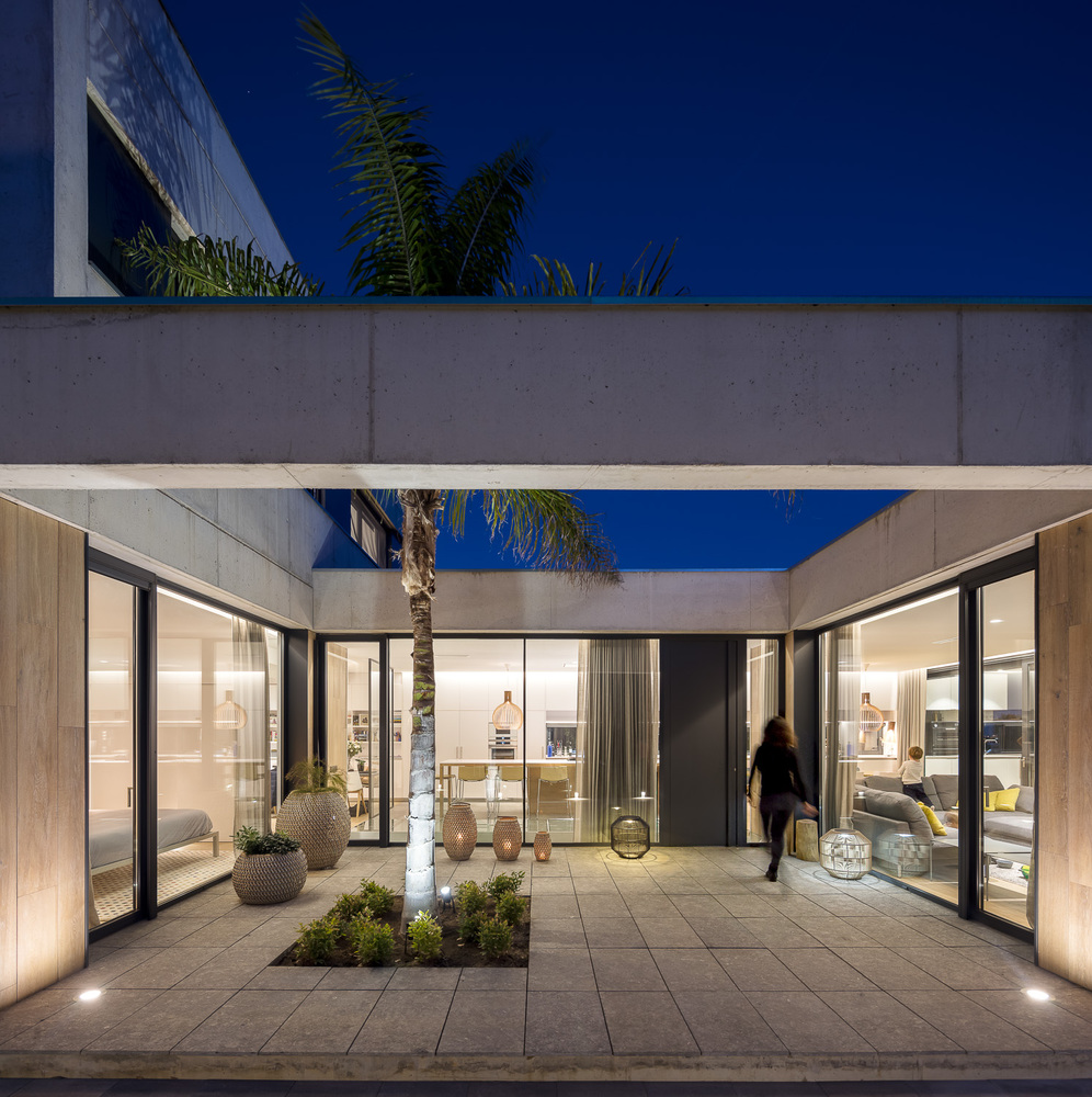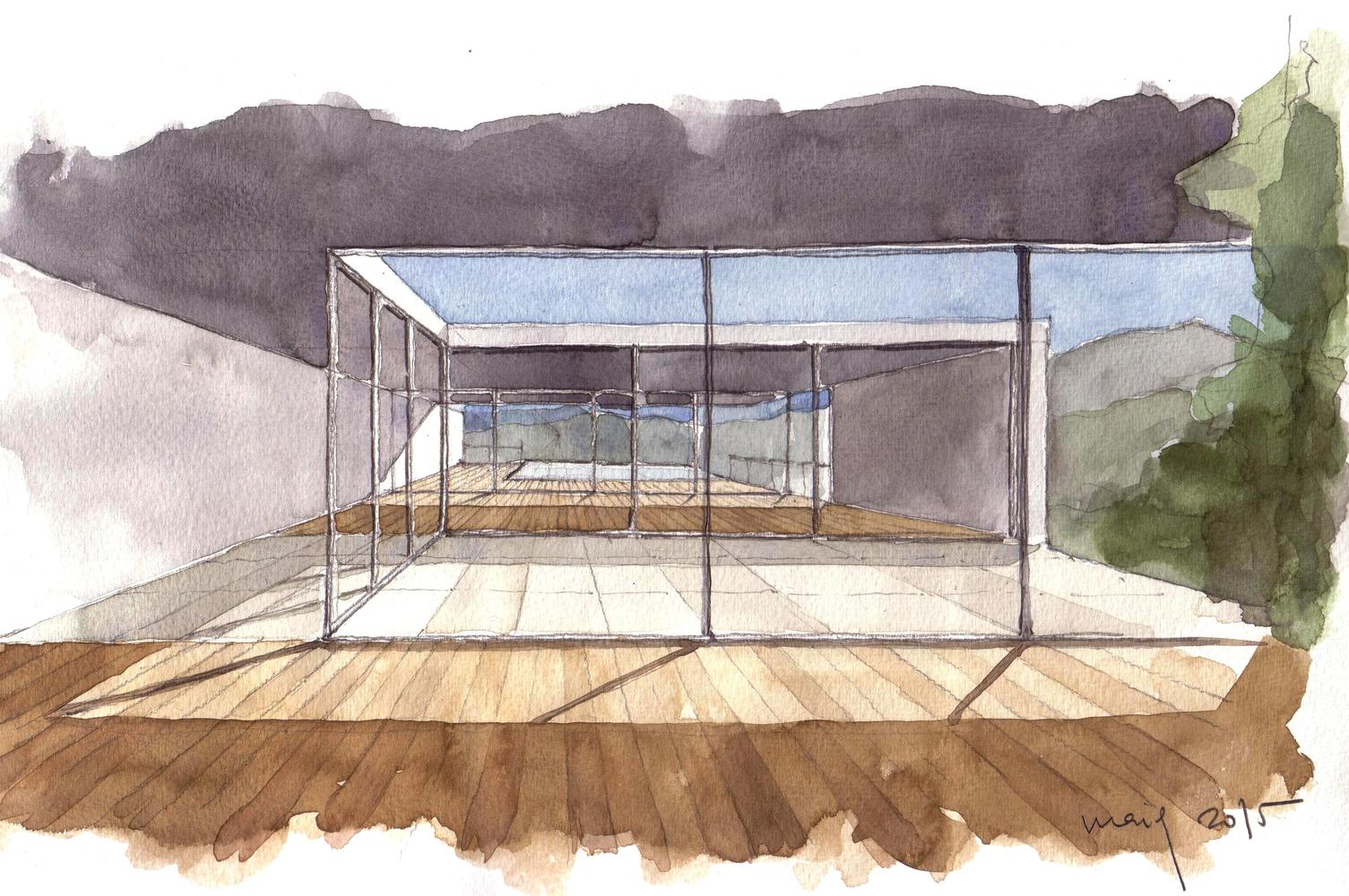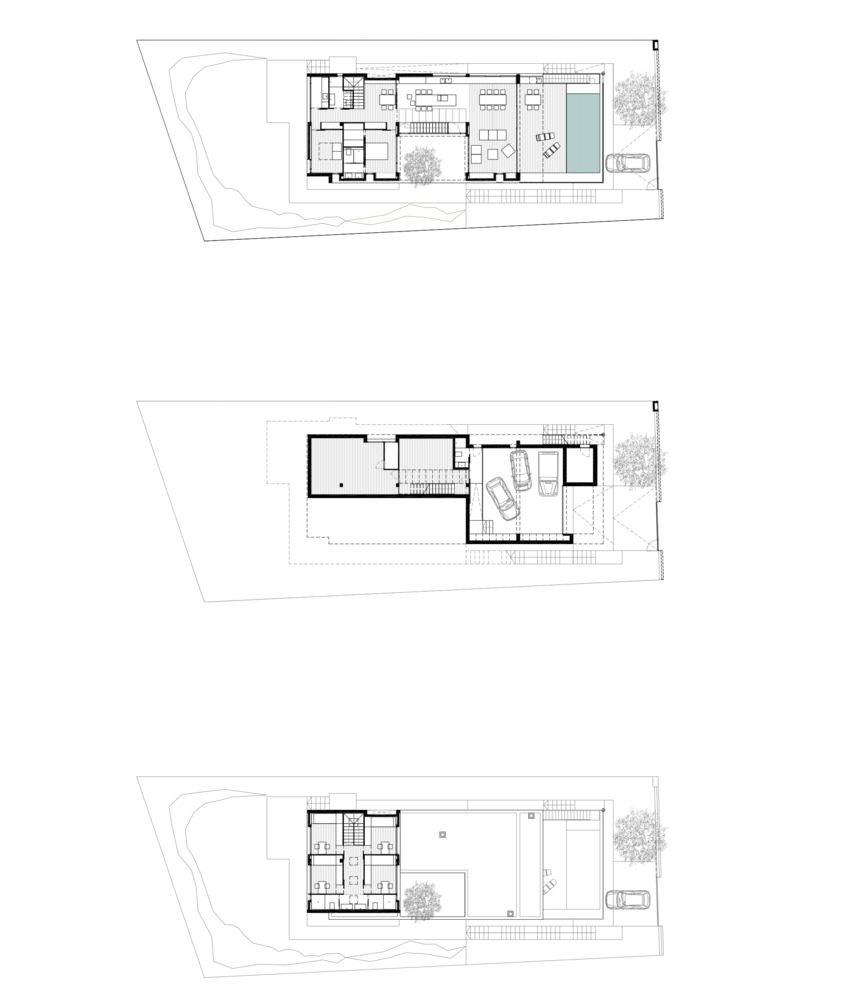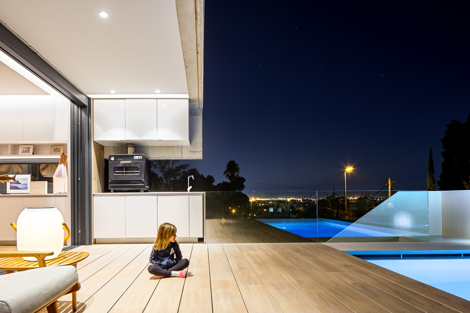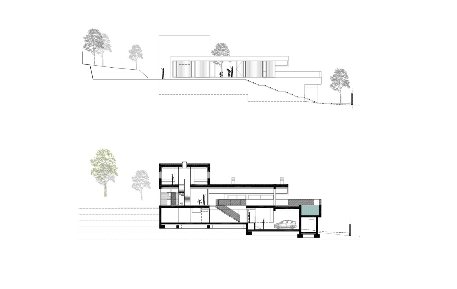 The plasticity of concrete allows us to create a house that meets functional needs while also adapting to its settings and to its owners’ expectations. A discreet, south-facing rectangular lot within a landscaped residential suburb with one short side fronting on the street and a notable incline has views that stretch beyond the immediate urban setting. This house is organized into three levels. The lower level is used for access and includes a garage, a stairway and several semibasement rooms. The first floor is global; it stretches from the back yard in through the house, making up its principal spaces. It then extends out the back of the house, becoming a terrace that overlooks the street and projects even further, towards the silhouetted landscape beyond. This floor contains bedrooms, an entry patio, a central kitchen and living space, a porch, terrace and a swimming pool. The second floor holds the rest of the bedrooms, and is situated at the back of the house.